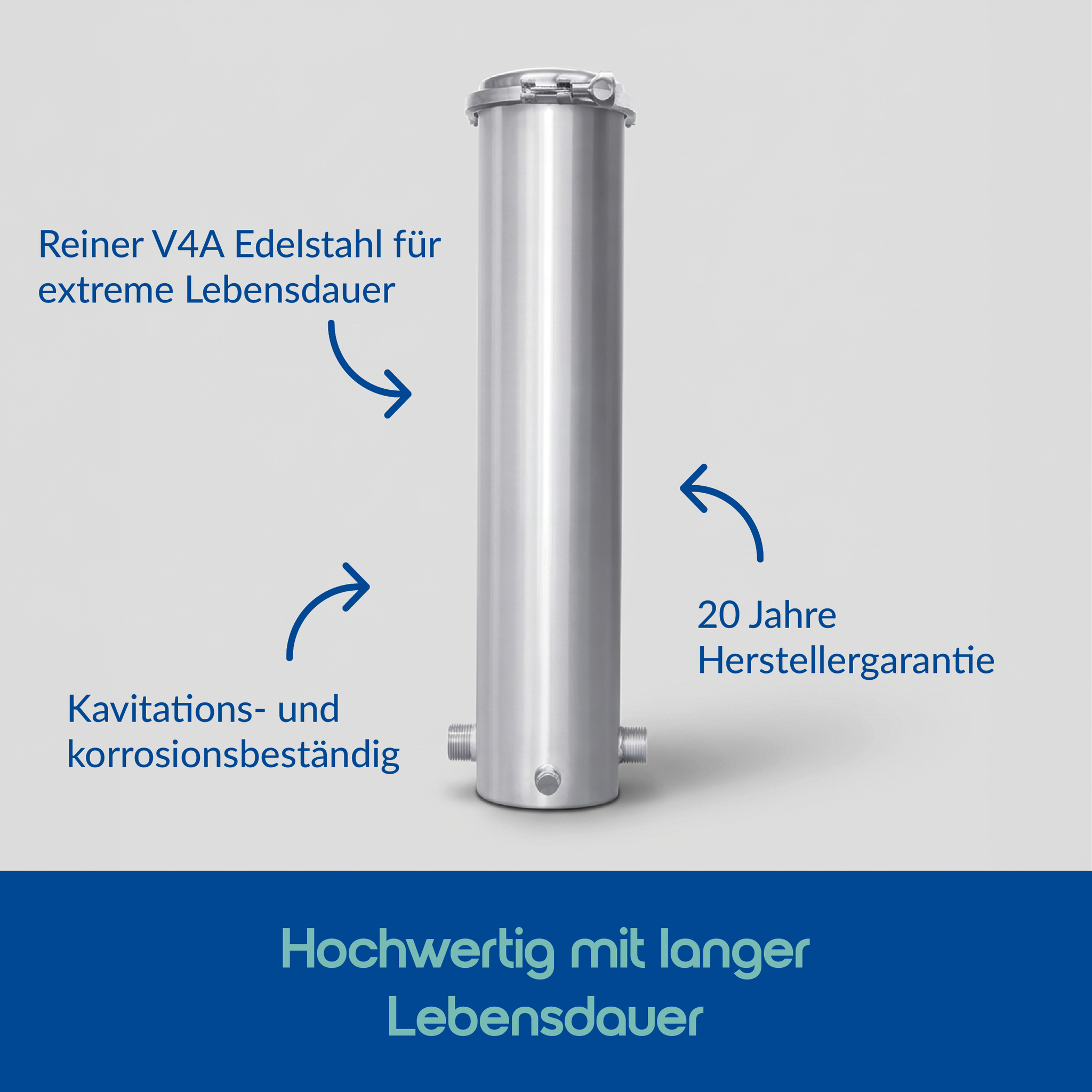 Die Hauswasserkartuschen lassen sich jährlich flexibel wechseln. Je nach Bedarf können Sie zwischen den drei verfügbaren Filtertypen (Kartuschen) wählen und Ihr System jederzeit an Ihre aktuelle Wasseranforderung anpassen.